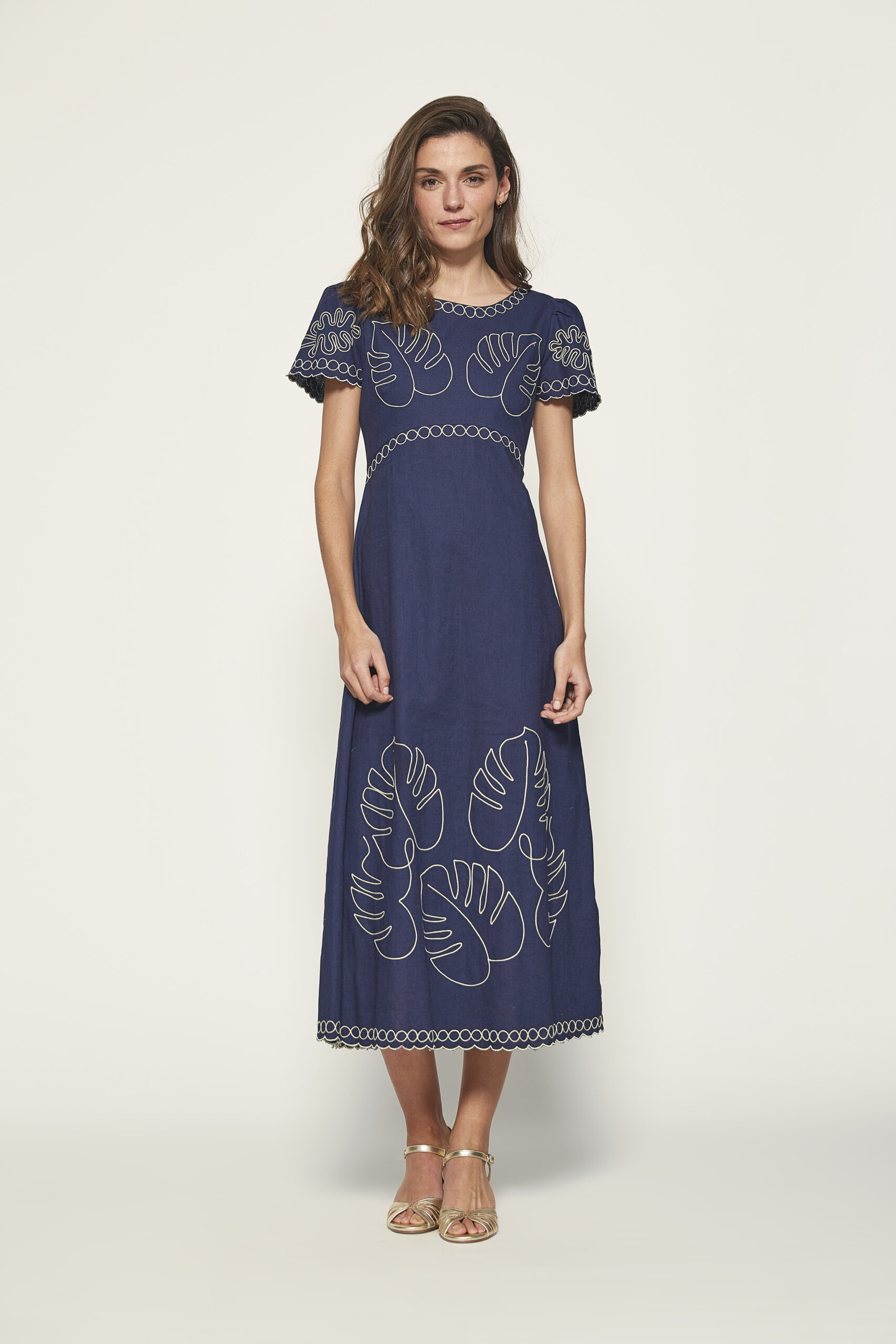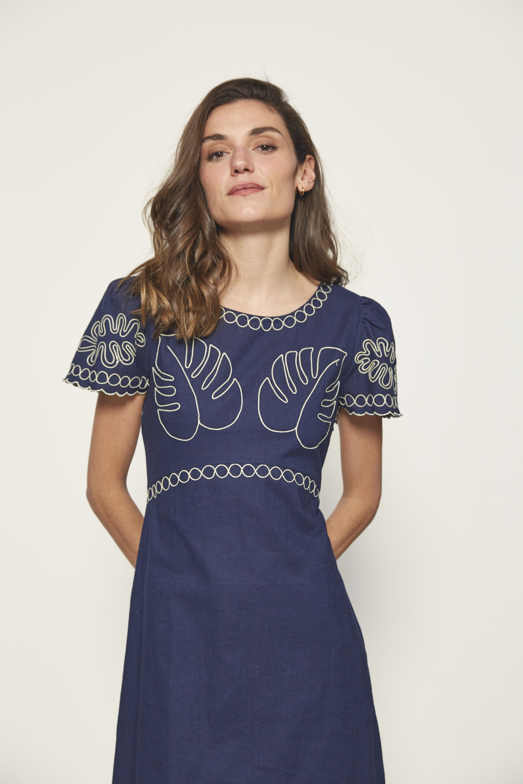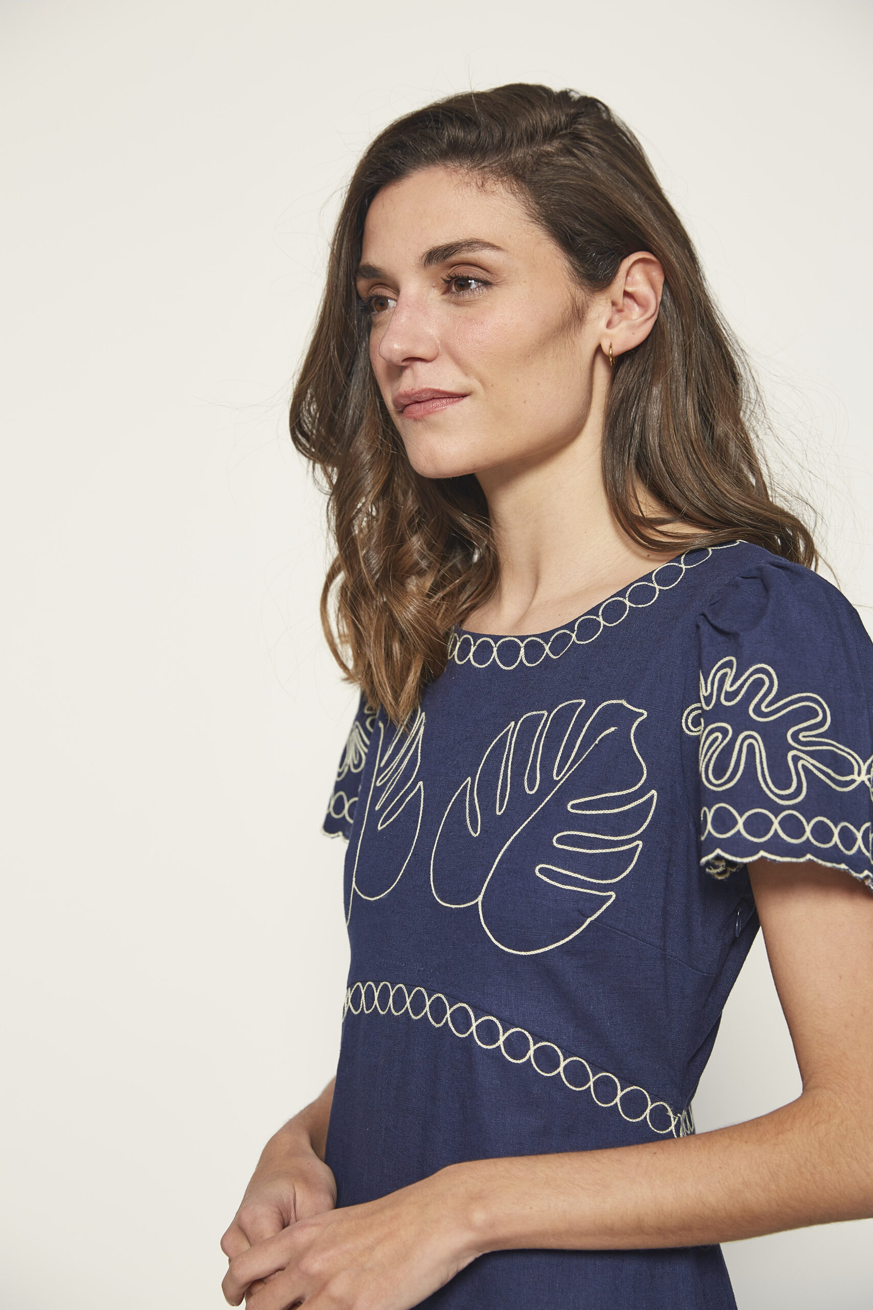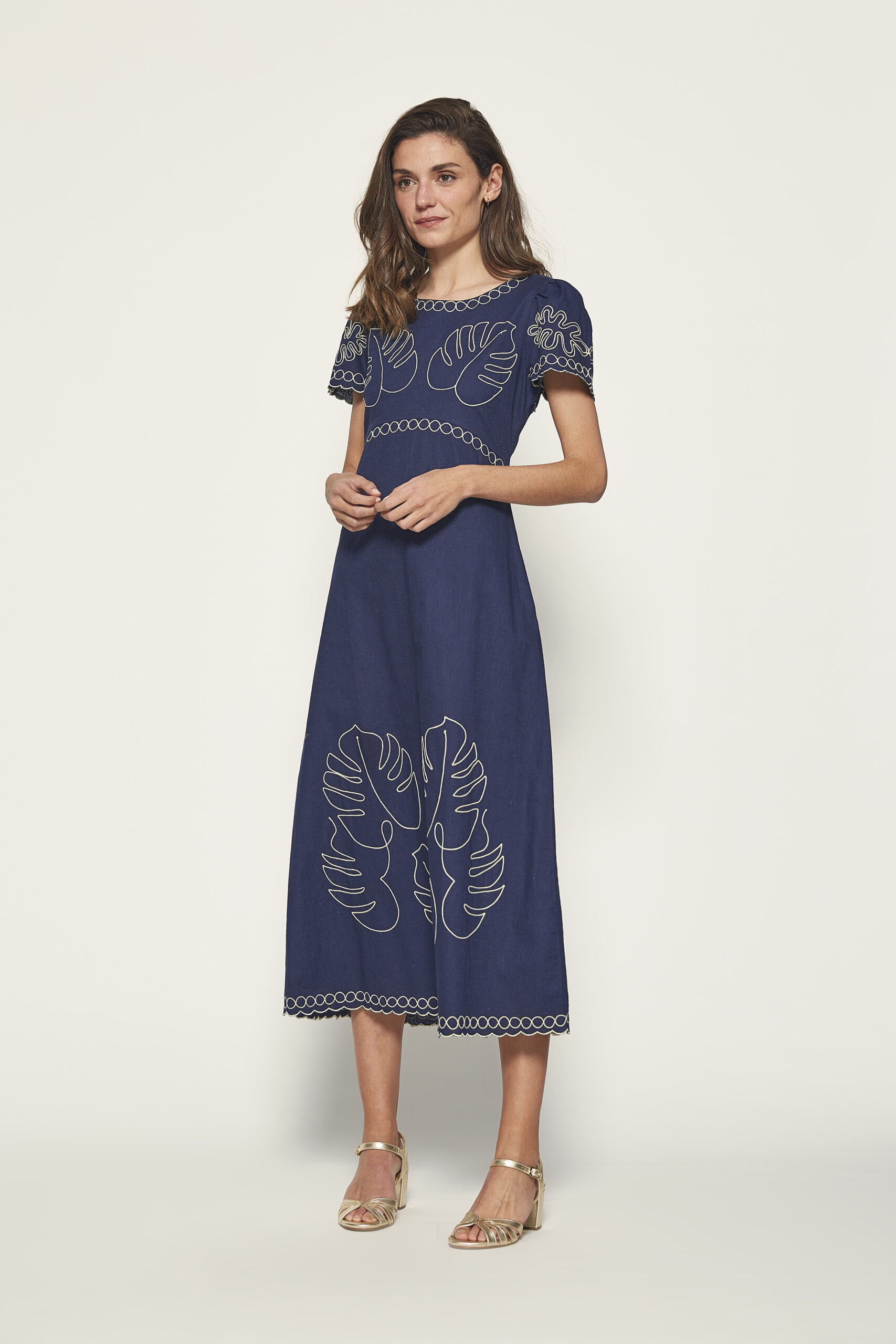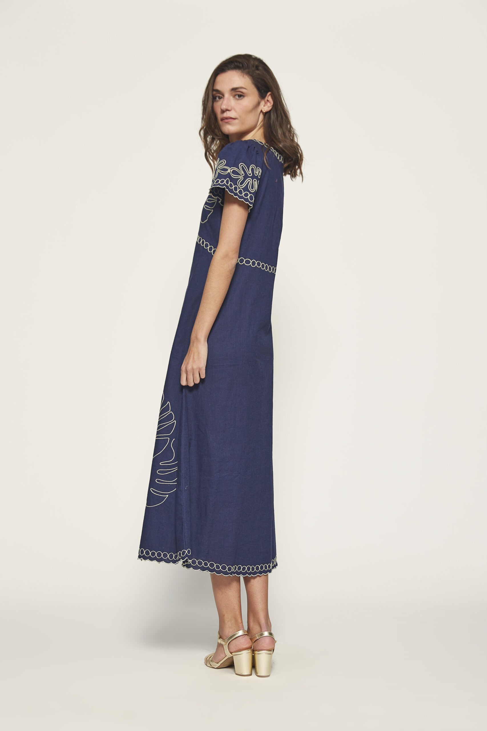 Vestido midi azul marino con bordados y manga corta. Tejido ligero para verano. 50% tejido lino y 50% tejido algodón. Corte recto. De la marca MD’M.
